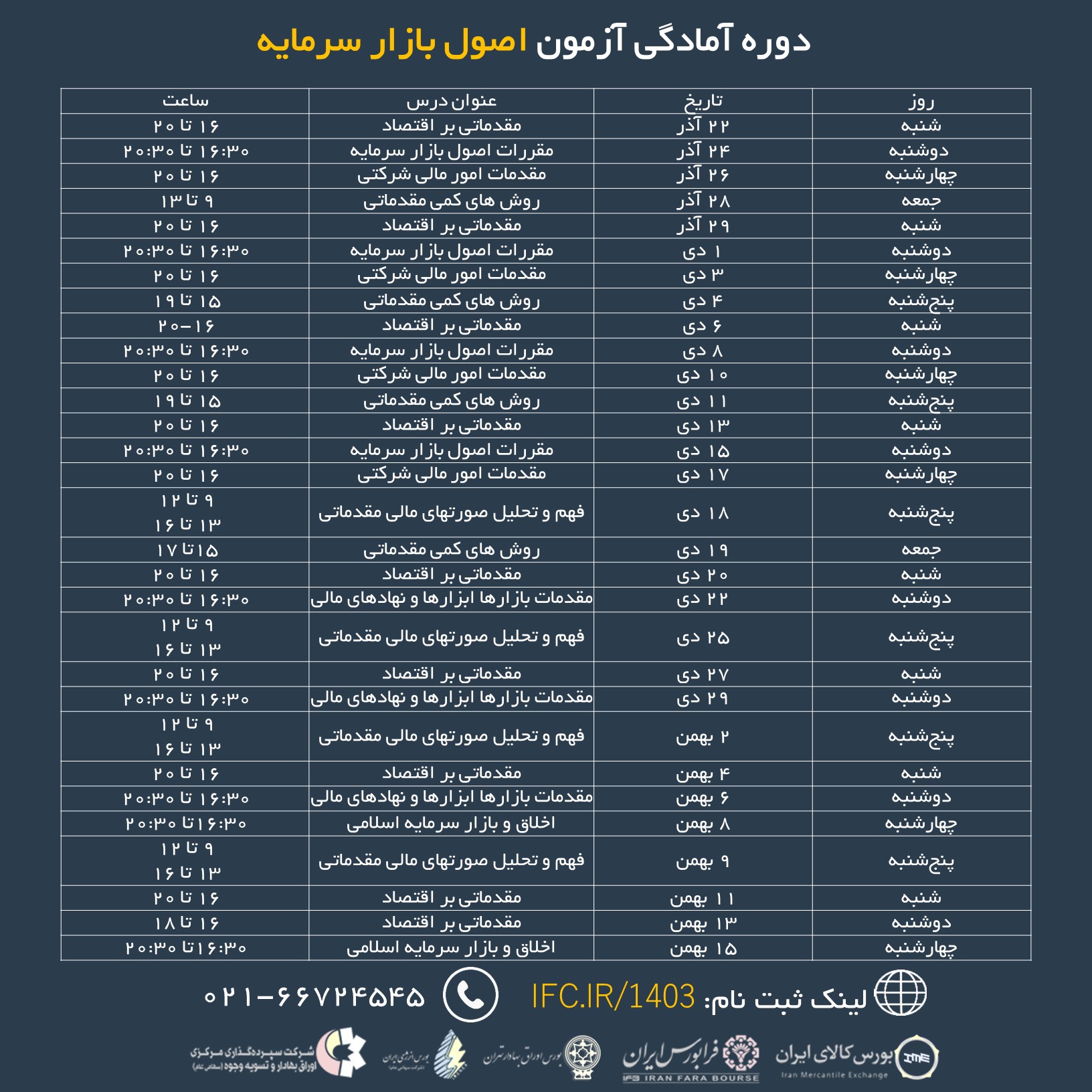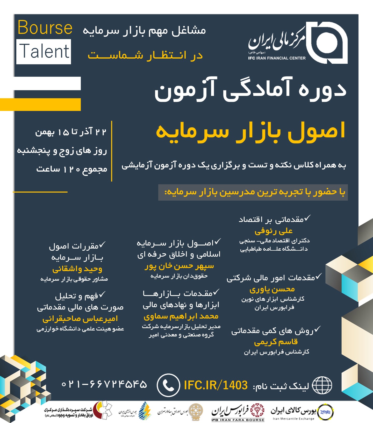 مرکز مالی ایران با هدف توسعه آموزش و ارتقا دانش فعالان بازار سرمایه، به منظور سهولت پذیرش در آزمون های مربوط به گواهینامه های حرفه ای بازار سرمایه، اقدام به برگزاری دوره آموزشی آمادگی آزمون اصول بازار سرمایه کرده است.