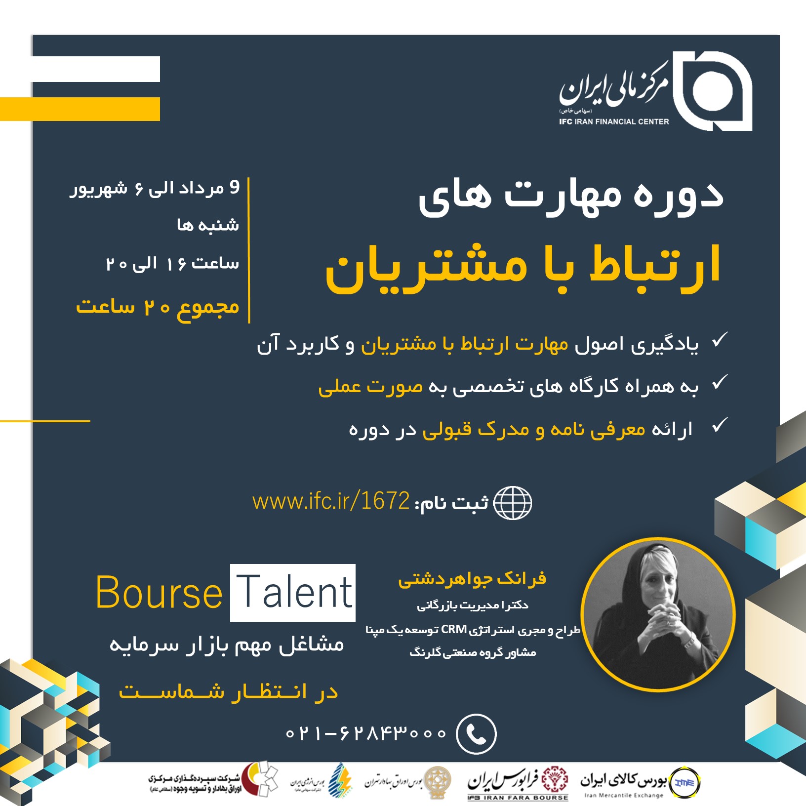مرکز مالی ایران در راستای آمادهسازی افراد جهت کار در مشاغل مالی دوره «مهارت های ارتباط با مشتریان» را طراحی و برگزار میکند تا شاغلین و علاقه مندان این حوزه مهارتهای لازم را کسب و توانایی های خود را در این زمینه افزایش دهند تا بتوانند از فرصت های شغلی مرتبط استفاده کنند. در این دوره شما شیوه صحبت و طرز بیان، شناخت مشتری، روشهای پاسخگویی به انواع مشتری اعم از مشتری شاکی، مشتری عصبانی، مشتریانی که سکوت میکنند و یا مشتریانی را که جهت کسب دانش و اطلاعات مراجعه میکنند، فرا خواهید گرفت.