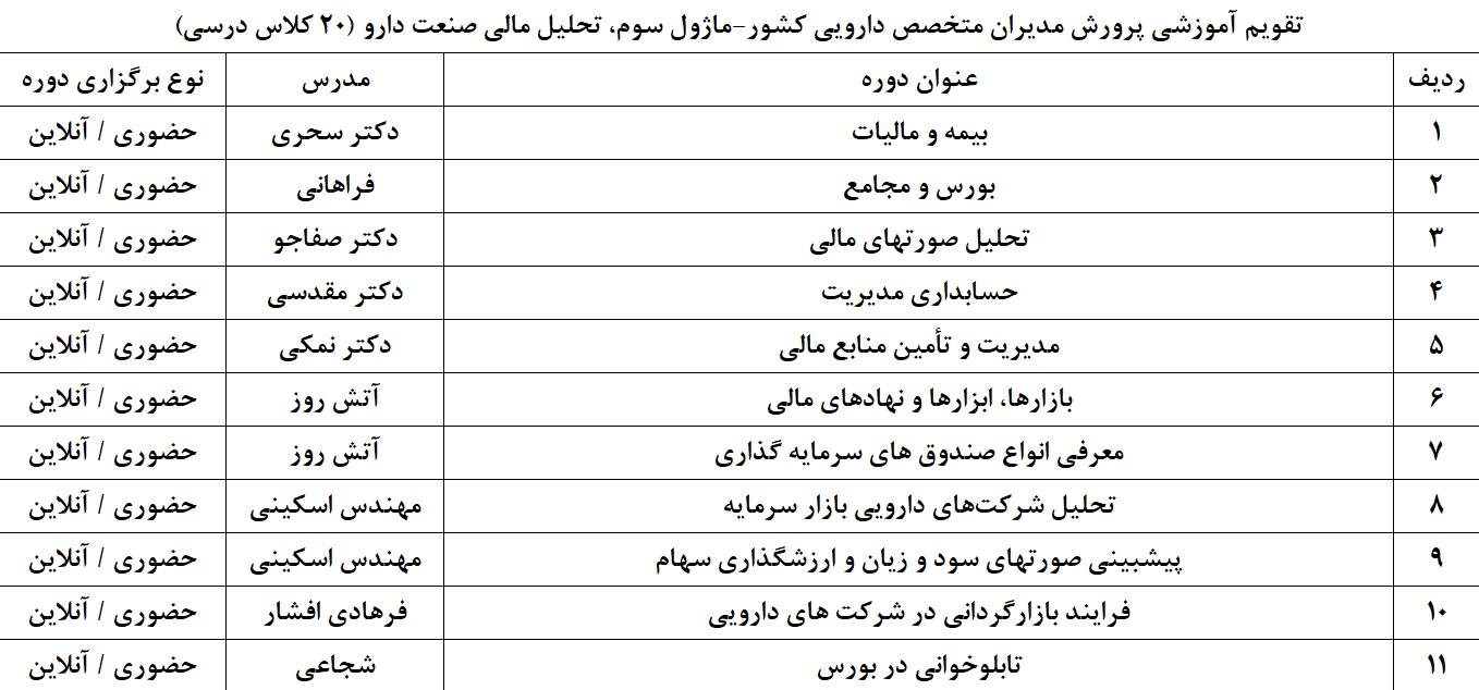 در این سرفصل آموزشی در ابتدا دانش پژوهان با موارد مرتبط با بیمه و مالیات در صنعت دارو آشنا می شوند و با توجه به دانش های آموخته شده در سرفصل های قبلی، عوامل موثر بر عملکرد شرکت را درک کرده و اثرات آن را تحلیل می نمایند. پیش بینی وضعیت مالی شرکت ها در آینده میتواند نکته مهمی باشد که تحلیل گران مالی صنعت داروسازی میتوانند در این سرفصل به آن دست پیدا کنند. مواردی همچون برگزاری جلسات مجامع، میتواند به دانش پژوهان این امکان را بدهد تا گزارشات عملکرد خود را به سهامداران ارائه نمایند. نکته مهمی که سازمانها از آن غافل میشوند نقش مهم حسابداری مدیریت در ارائه اطلاعات کاربردی به مدیران ارشد سازمان می باشد. اطلاعاتی که از گذشته و آینده شرکت خبر میدهد. این موضوع میتواند یک مدیر پیش رو را از یک مدیر معمولی متمایز سازد. دانش تحلیل صورت های مالی شرکهای صنعت دارویی میتوانند به تحلیل گران صنعت کمک کند. مدیریت و تأمین منابع مالی در صنعت دارویی نکته مهم و قابل توجهی است که گریبان شرکت ها را گرفته است. شرکت هایی که این موضوع را درک کرده اند توانسته اند جایگاه خود را در بازار تثبیت و حتی ارتقاء دهند ولی شرکت های بزرگی در صنعت وجود دارند که در سنوات گذشته جایگاه خوبی در صنعت داشته اند ولی با مشکلات تأمین منابع مالی دست و پنجه نرم میکنند و در سالهای اخیر جایگاه خود را در بازار از دست داده اند و سهم خود را به رقبا سپرده اند. بازارها، ابزارها و نهاد های مالی میتوانند درکنار شرکت ها به آنها کمک کنند تا بتوانند جایگاه خود را در صنعت حفظ کنند. کسب دانش موضوعات مذکور و آشنایی با انواع صندوق های سرمایه گذاری، پیش بینی صورتهای سود و زیان و ارزشگذاری سهام، فرایند و نحوه بازارگردانی در شرکت های دارویی و در نهایت تابلوخانی در بورس میتوانند از هر فردی، یک متخصص و تحلیل گر صنعت دارویی تربیت نماید.